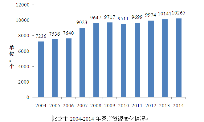 北京是我國醫(yī)療衛(wèi)生資源最為密集的地區(qū)之一。2014年末,全市醫(yī)療衛(wèi)生機(jī)構(gòu)數(shù)達(dá)10265家(包含15家駐京部隊醫(yī)療機(jī)構(gòu)),其中醫(yī)療機(jī)構(gòu)10107家(含89家三級醫(yī)療機(jī)構(gòu)、147家二級醫(yī)療機(jī)構(gòu)以及600家一級醫(yī)療機(jī)構(gòu)),其他衛(wèi)生機(jī)構(gòu)158家。除擁有為數(shù)眾多的綜合醫(yī)院外,北京有口腔、眼科、腫瘤、心血管等各類??漆t(yī)院,各類醫(yī)院平均治愈率近60%,大多數(shù)??漆t(yī)院病人治愈率更是超過90%,高于全國平均水平。