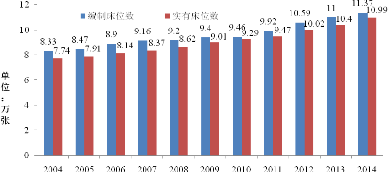 2004-2014年北京市醫(yī)療機(jī)構(gòu)床位情況