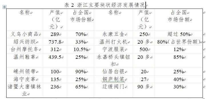 浙江是我國產(chǎn)業(yè)集群最為密集的地區(qū)。據(jù)浙江省經(jīng)貿(mào)委調(diào)查,2003年浙江省工業(yè)總產(chǎn)值在10億元以上的制造業(yè)“塊狀經(jīng)濟(jì)”有149個,工業(yè)總產(chǎn)值合計1萬億元,約占全省總量的50%(董樹榮,2005)。其中,較典型的有溫州鞋革和服裝、紹興(縣)印染和織造、樂清低壓電器、蕭山化纖、海寧皮革、嵊州領(lǐng)帶、永康五金、永嘉紐扣、桐廬制筆、諸暨襪業(yè)等。目前,這些“塊狀經(jīng)濟(jì)”已經(jīng)成為浙江省乃至全國的專業(yè)生產(chǎn)加工出口基地。例如,溫州市區(qū)打火機產(chǎn)量占世界的70%;嵊州領(lǐng)帶產(chǎn)量占全國的80%、占世界領(lǐng)帶市場的30%;永康衡器產(chǎn)量占全國的2/3;蒼南鋁制徽章的國內(nèi)市場占有率高達(dá)45%;海寧許村、許巷的裝飾布占全國市場份額的35%以上;樂清柳市的低壓電器在全國的市場占有率超過1/3。從表2中可以看出,浙江省一些主要塊狀經(jīng)濟(jì)(或產(chǎn)業(yè)集群)占全國的市場份額都很大,其中義烏小商品、嵊州領(lǐng)帶、諸暨大唐鎮(zhèn)襪業(yè)、永康五金、溫州打火機、永嘉橋頭鎮(zhèn)鈕扣等都超過50%,而紹興紡織、寧波服裝、溫州鞋革、臺州摩托車、義烏小商品、永康五金、諸暨大唐鎮(zhèn)襪業(yè)等的產(chǎn)值規(guī)模則超過200億元。