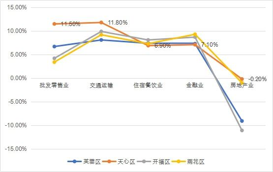 2017年天心區(qū)服務(wù)業(yè)五大支柱產(chǎn)業(yè)占比分別為金融業(yè)、批發(fā)和零售業(yè)、住宿和餐飲業(yè)、房地產(chǎn)和交通運(yùn)輸業(yè)占比分別為40%、30%、16%、9%和5%。金融業(yè)占比達(dá)到40%說明現(xiàn)代服務(wù)業(yè)高度發(fā)達(dá),是天心區(qū)服務(wù)業(yè)結(jié)構(gòu)調(diào)整和優(yōu)化的重要表現(xiàn)。房地產(chǎn)業(yè)占比僅僅為5%,說明經(jīng)濟(jì)擺脫了房地產(chǎn)“依賴癥”。
