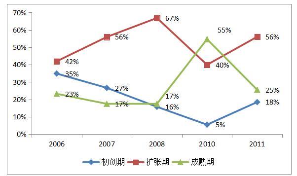 圖:2006-2014年我國風(fēng)險(xiǎn)投資分階段分布 [ 數(shù)據(jù)來源:清科研究中心《中國股權(quán)投資市場(chǎng)2014年全年回顧》]