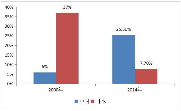 圖:中日兩國(guó)高科技產(chǎn)品出口占全球份額的變化