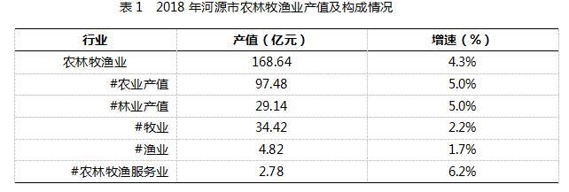 2018年,河源市GDP首破千億元大關(guān),但經(jīng)濟(jì)總量及人均GDP位居廣東省下游水平,經(jīng)濟(jì)增速有所放緩但仍穩(wěn)居全省中上游水平,整體處于工業(yè)化和城市化向中期邁進(jìn)階段。產(chǎn)業(yè)結(jié)構(gòu)逐步合理,服務(wù)業(yè)比重首次突破50%,農(nóng)民人均收入首超全國平均水平,高質(zhì)量發(fā)展穩(wěn)步推進(jìn),新舊動能轉(zhuǎn)換明顯加快。從產(chǎn)業(yè)結(jié)構(gòu)看,第一產(chǎn)業(yè)占據(jù)河源市GDP的10%左右,傳統(tǒng)農(nóng)牧業(yè)仍占據(jù)現(xiàn)代農(nóng)業(yè)主導(dǎo)地位,農(nóng)林牧漁服務(wù)業(yè)成為現(xiàn)代農(nóng)業(yè)發(fā)展亮點(diǎn),但總量規(guī)模仍需亟待提升。從農(nóng)業(yè)發(fā)展載體看,2018年新增4個(gè)省級現(xiàn)代農(nóng)業(yè)產(chǎn)業(yè)園、5個(gè)省級農(nóng)業(yè)標(biāo)準(zhǔn)化示范區(qū),燈塔盆地核心區(qū)建設(shè)穩(wěn)步推進(jìn),龍川國家級電子商務(wù)進(jìn)農(nóng)村綜合示范縣順利通過國家驗(yàn)收,船塘鎮(zhèn)(板栗)、龍窩鎮(zhèn)(茶葉)入選全國農(nóng)業(yè)產(chǎn)業(yè)強(qiáng)鎮(zhèn)示范建設(shè),農(nóng)業(yè)農(nóng)村產(chǎn)業(yè)發(fā)展載體進(jìn)一步夯實(shí)。農(nóng)村重點(diǎn)領(lǐng)域改革深入推進(jìn),農(nóng)村集體產(chǎn)權(quán)制度改革穩(wěn)步推進(jìn),農(nóng)村土地確權(quán)登記頒證基本完成,農(nóng)村產(chǎn)權(quán)流轉(zhuǎn)管理服務(wù)平臺和鎮(zhèn)(街)級平臺逐步完善,信用村和鄉(xiāng)村金融服務(wù)站實(shí)現(xiàn)行政村全覆蓋。