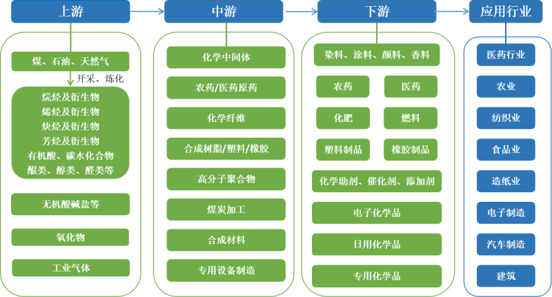 石化產(chǎn)業(yè)鏈上游涉及石油、天然氣、煤、無機鹽礦等開采,中游涉及基礎化學原料、化學中間體、合成纖維、合成橡膠等以及衍生品的生產(chǎn),下游涉及農(nóng)藥、化肥、醫(yī)藥、電子化學品、化學助劑、日用化學品等終端產(chǎn)品制造。