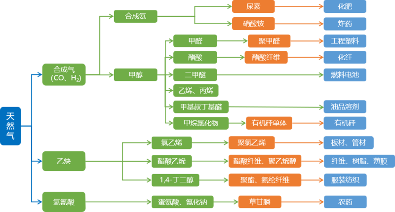 ——天然氣化工產(chǎn)業(yè)鏈。以天然氣為原料,通過凈化分離、裂解、氯化、硫化、脫氫等反應,生產(chǎn)合成氨、甲醇、乙炔、氫氰酸等基本化工原料,再合成尿素、草甘膦等化肥農(nóng)藥、塑料、纖維、橡膠、樹脂、有機硅、化學溶劑等產(chǎn)品。