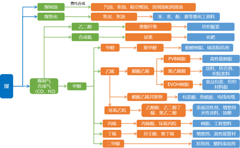 ——現(xiàn)代煤化工產(chǎn)業(yè)鏈。煤化工是以煤為原料,經(jīng)過化學加工生產(chǎn)多種清潔燃料和基礎化工原料的產(chǎn)業(yè),包括煤制油、煤制天然氣、低階煤分質(zhì)利用、煤制烯烴、煤制乙二醇等煤制化學品以及煤基新材料。