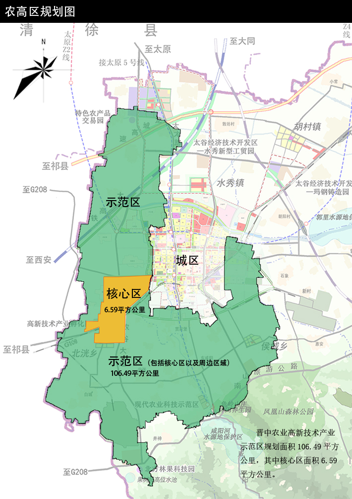 晉中農(nóng)高區(qū)核心區(qū)位于農(nóng)高區(qū)西部,北至箕城街,東至108國(guó)道、北洸村東,南至南洸村北部,西至北洸村東、曹莊村東。規(guī)劃面積為6.59平方公里。