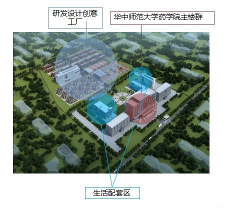 本項目分為三大功能區(qū):華中師范大學(xué)藥學(xué)院主樓群、研發(fā)設(shè)計創(chuàng)意工廠、生活配套區(qū)。